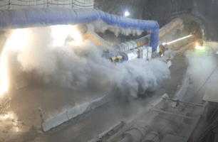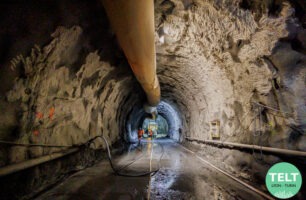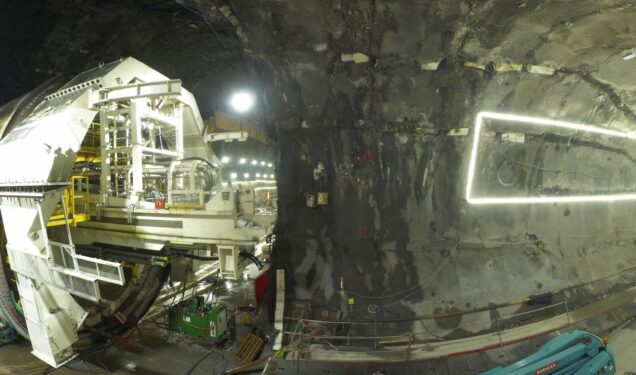 Les trois premières remorques du tunnelier sont déjà préassemblées et stationnées dans le tunnel, prêtes à être reliées à la tête de forage.